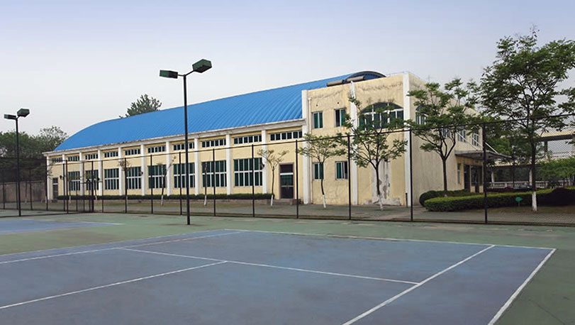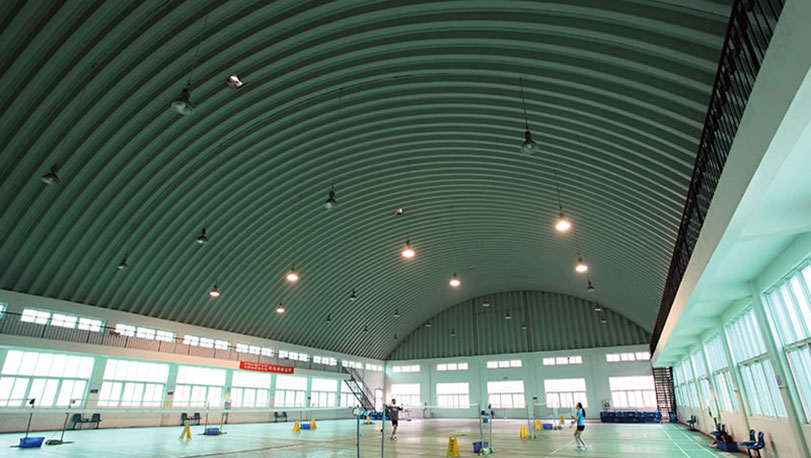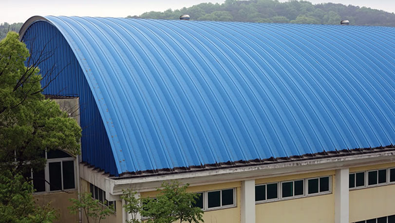 2003年建設,拱型建筑。采用熱鍍鋅PE聚酯彩涂鋼板,顏色為海藍色,牌號為TS280GD,鍍鋅量180克/平方米。