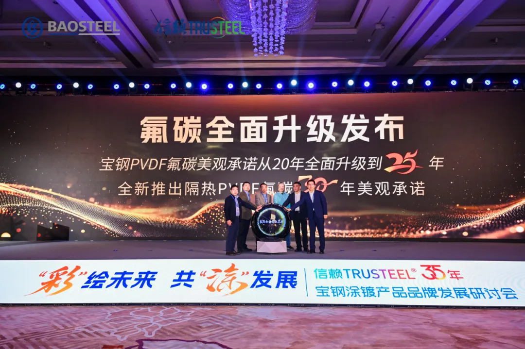 在與會嘉賓的共同見證下,寶鋼鄭重宣布對氟碳彩涂產品的質量承諾實現跨越式提升:將已堅守二十余年的20年質保標準,一舉提升至25年。與此同時,寶鋼更進一步,同步推出了具備優異隔熱性能的 “隔熱氟碳30年” 全新標準。