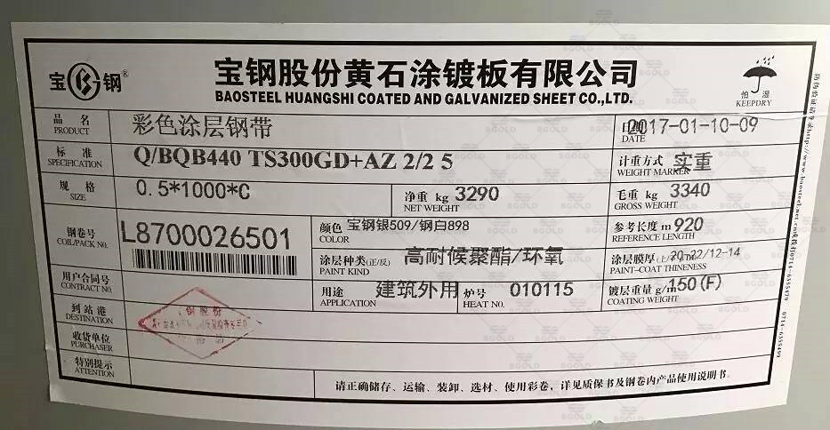 上海寶鋼彩鋼板標簽全稱為:寶山鋼鐵股份有限公司,標簽右側有總部二字。