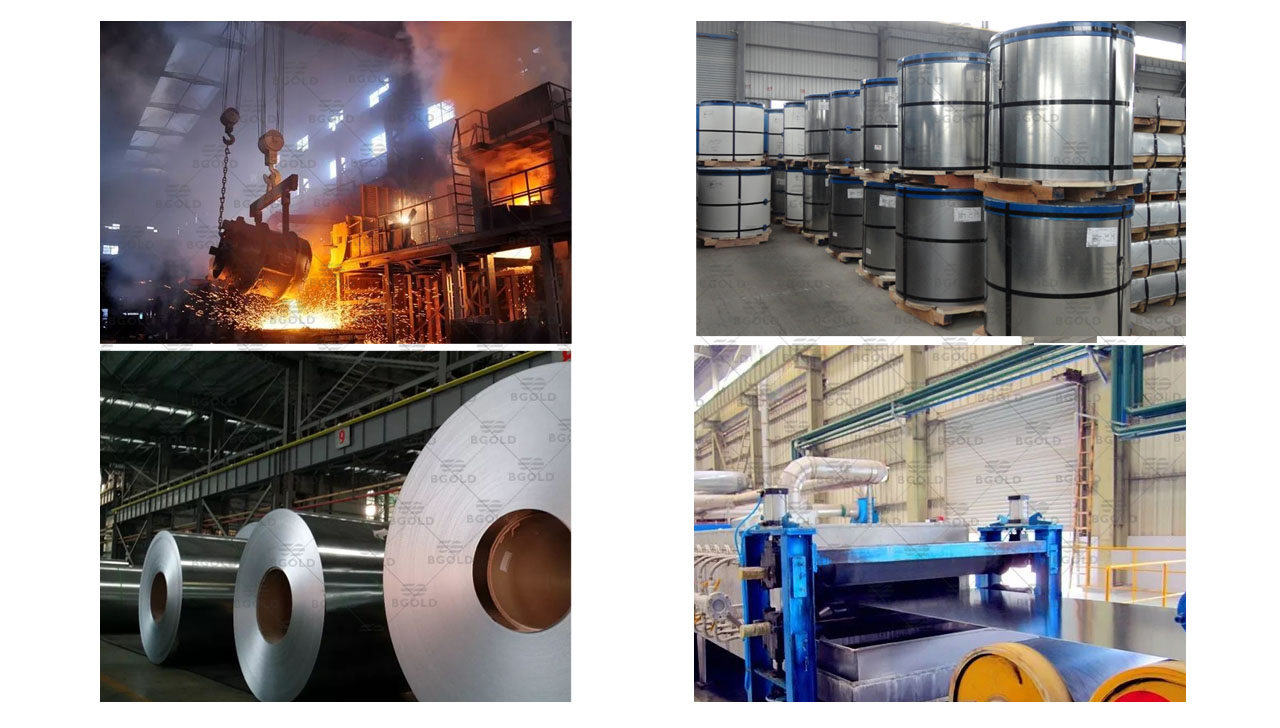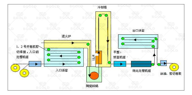 生產(chǎn)加工鍍鋅鋼卷可以分為三大步:首先將整卷帶鋼進(jìn)行酸洗除銹、除污,讓鍍鋅鋼帶表面達(dá)到光亮干凈的效果;酸洗后,通過(guò)氯化銨或氯化鋅水溶液或者氯化銨和氯化鋅混合水溶液中進(jìn)行清洗,然后送入熱浸鍍槽內(nèi),進(jìn)行鍍鋅工藝;待鍍鋅工藝完成后即可入庫(kù)包裝。